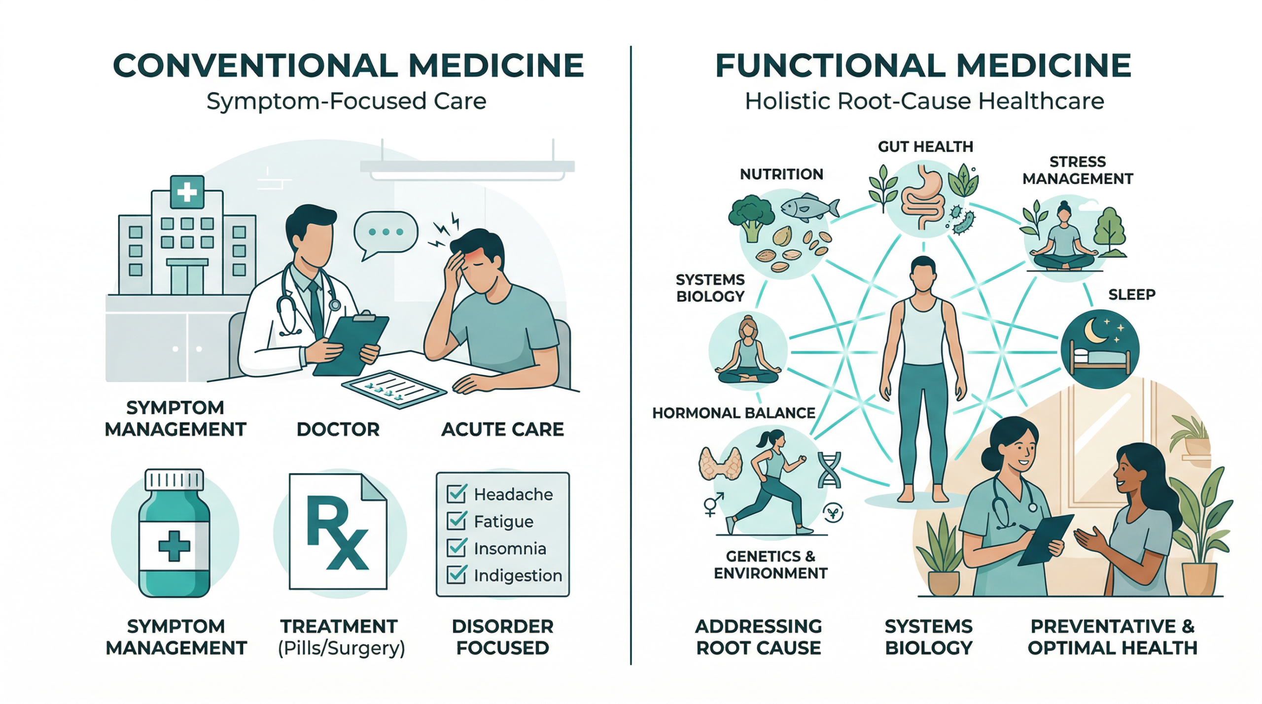 Functional medicine focuses on identifying and addressing the underlying causes of symptoms, rather than simply managing them.